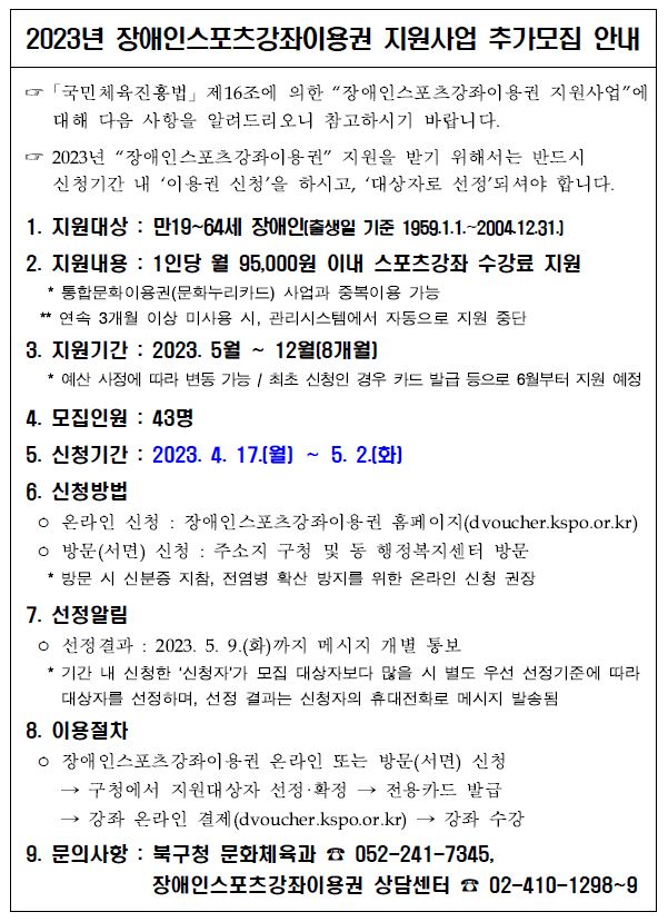 2023년 장애인 스포츠강좌이용권 지원사업 대상자 추가모집 안내