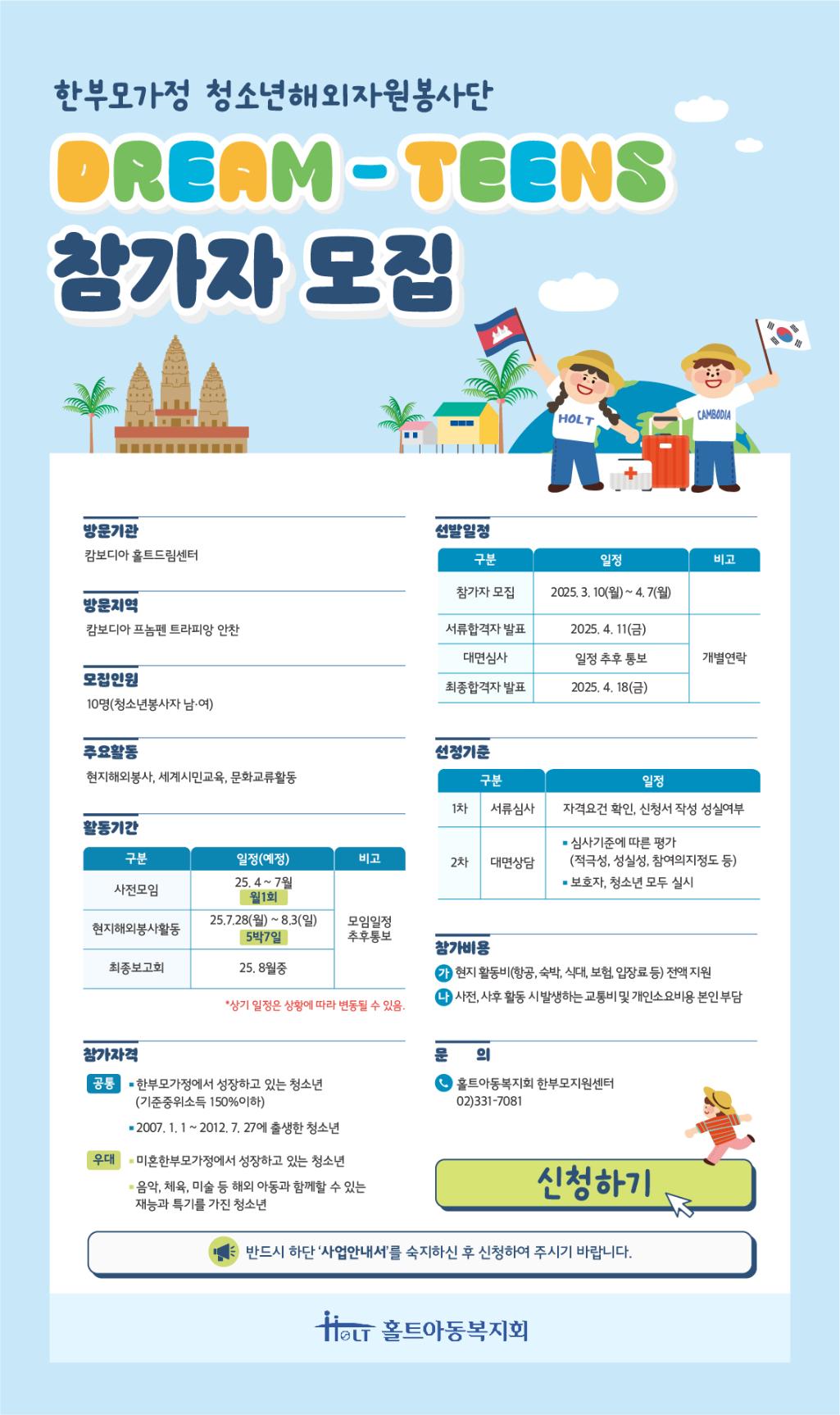 홀트아동복지회 협업, 한부모가정 청소년해외자원봉사단 'DREAM-TEENS' 신청 안내