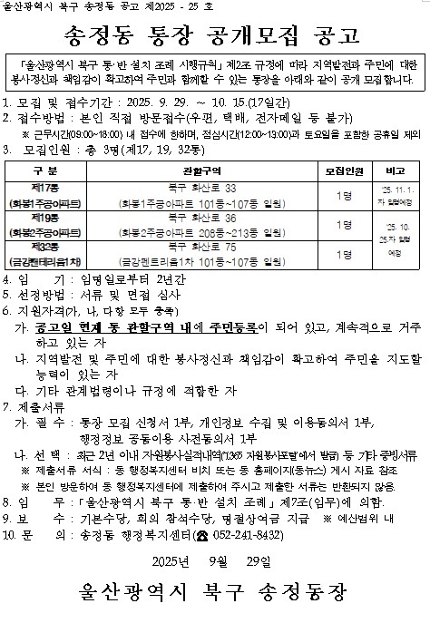 송정동 통장 공개모집 공고(제17, 19, 32통)