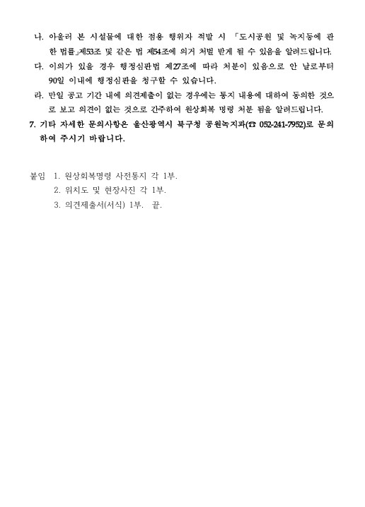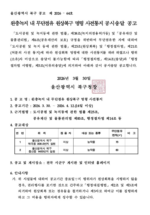 완충녹지 내 무단점유 원상복구 명령 사전통지 공시송달 공고