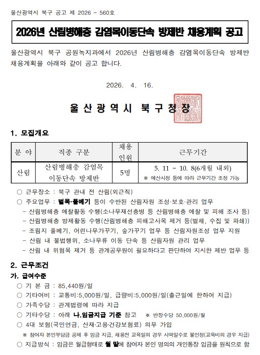 2026년 산림병해충 감염목 이동단속 방제반 채용공고