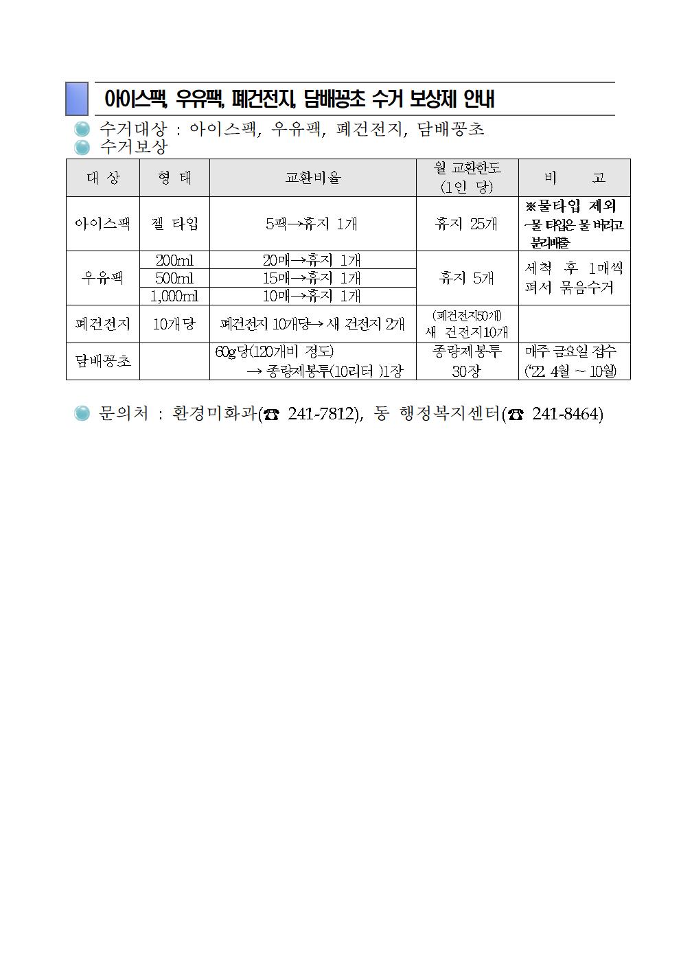 아이스팩, 우유팩, 폐건전지, 담배꽁초 수거 보상제 안내
