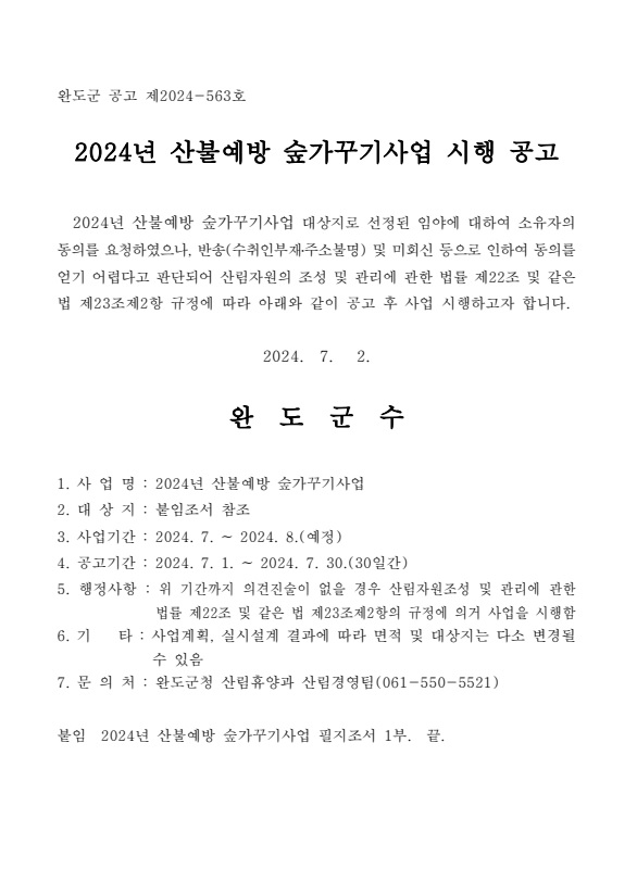 2024년 산불예방 숲가꾸기사업 시행 공고