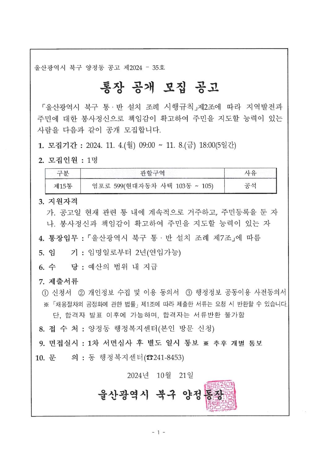 양정동 통장(제15통장) 모집 재공고