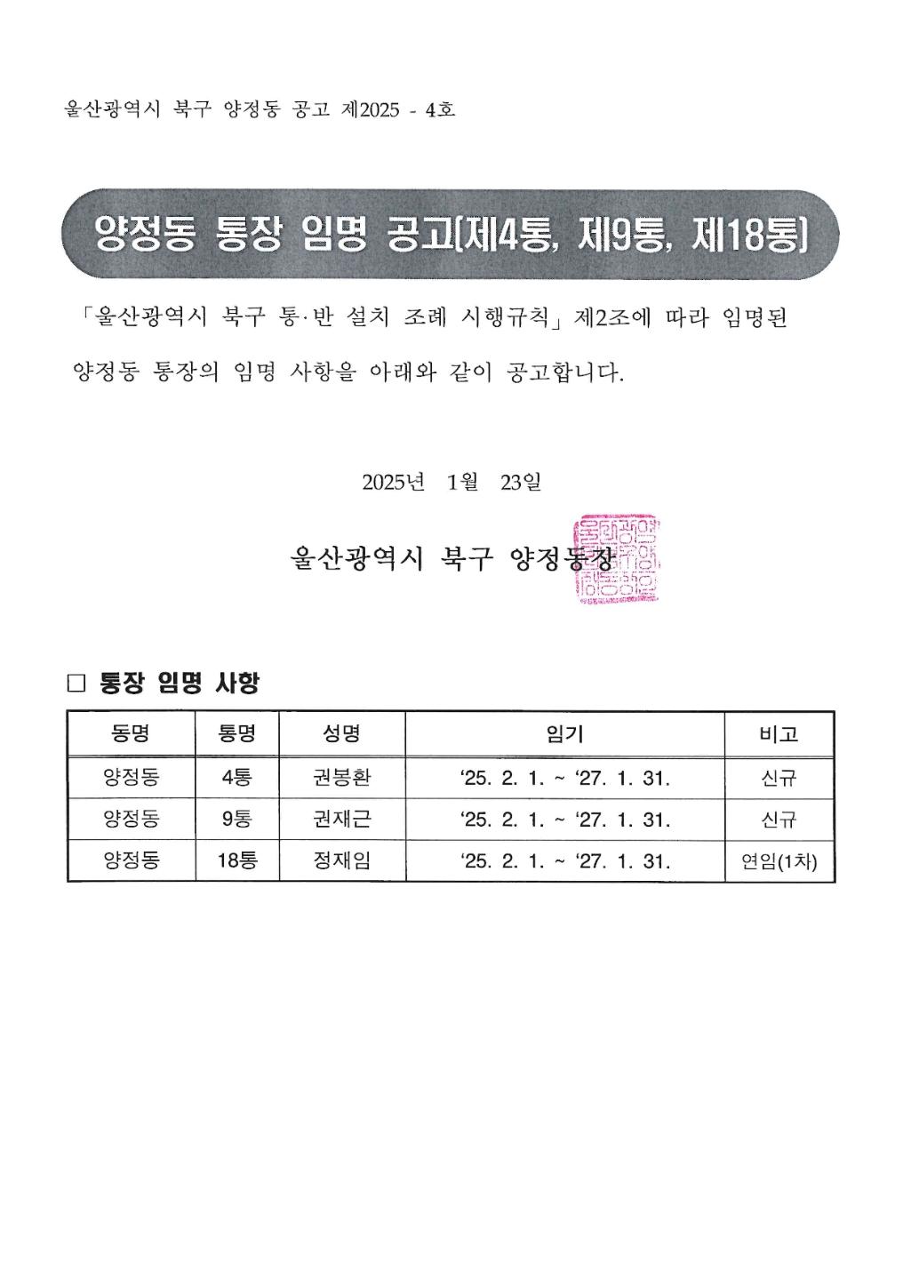 통장 임명사항 공고(제4통, 제9통, 제18통)