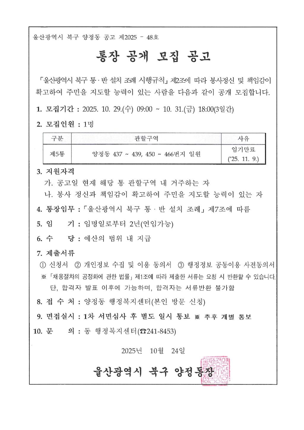 양정동 통장 공개모집 공고(제5통)