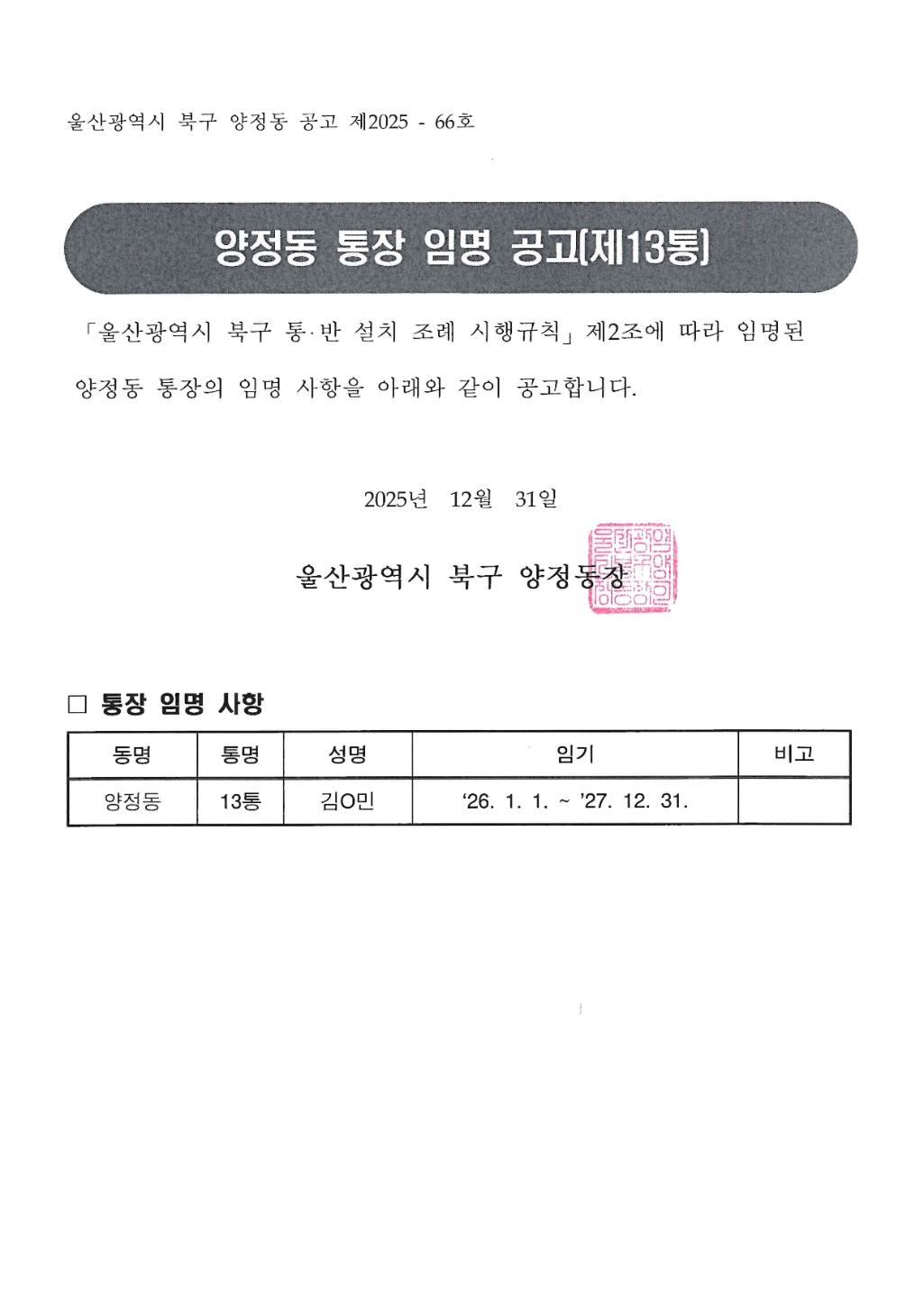 양정동 통장 임명 공고(제13통장)