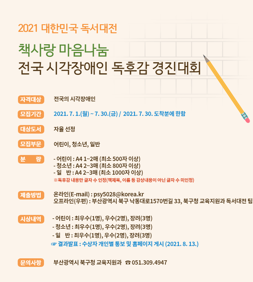 2021 대한민국 독서대전 「책사랑 마음나눔 전국 시각장애인 독후감 경진대회」 안내