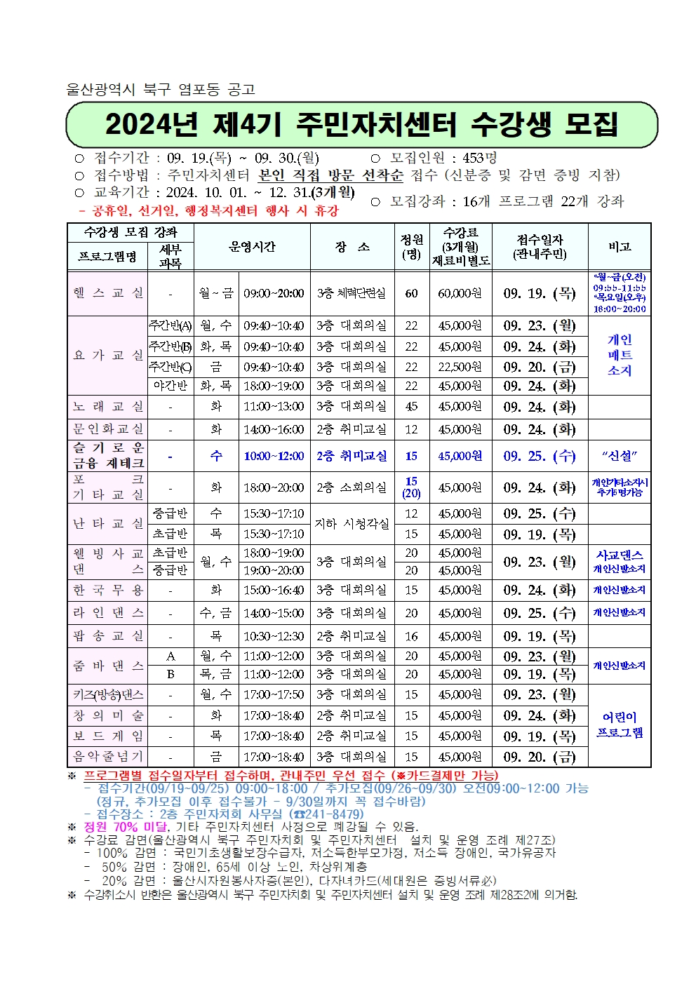 2024년 4분기 주민자치센터 수강생 모집 공고(접수일 : 9/19~)