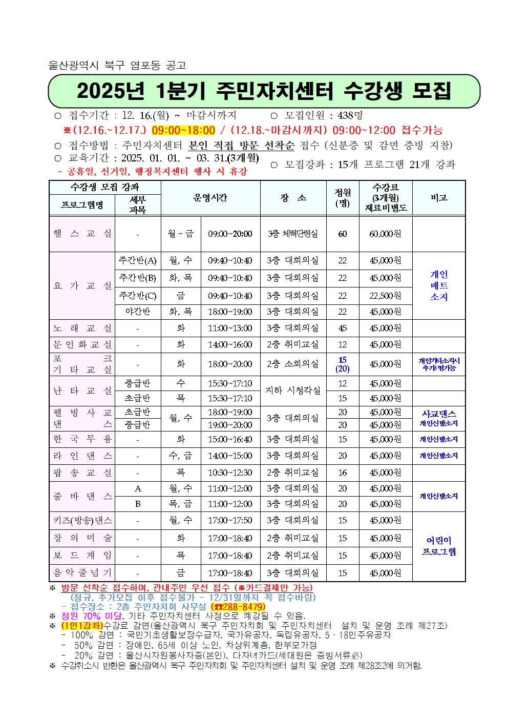 2025년 1분기 주민자치센터 수강생 모집 공고(접수일 : 12/16~)
