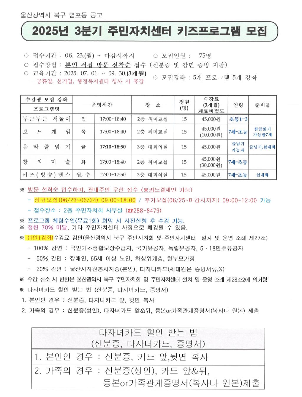 2025년 3분기 주민자치센터 키즈프로그램 수강생 모집 공고(접수일 : 6/23~)