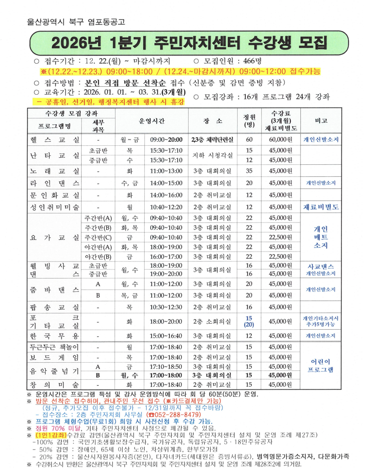 2026년 1분기 염포동 주민자치센터 수강생 모집 공고
