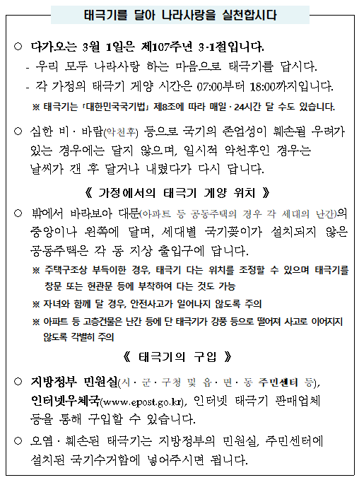 제107주년 3·1절 나라사랑 태극기 달기 운동 안내