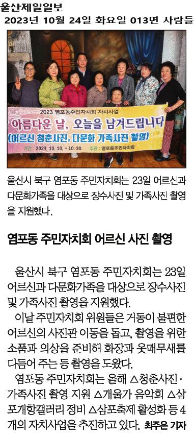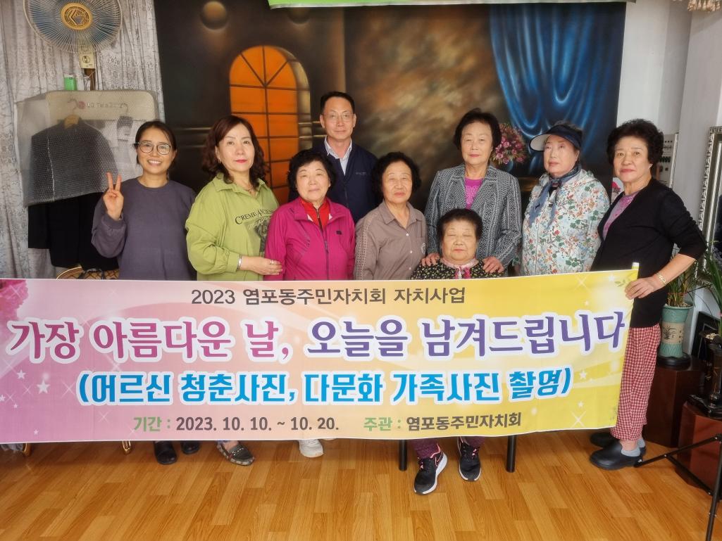 - 사업명 : 2023년 주민자치회 자치사업 "당신의 오늘을 남겨드립니다. - 내 용 : 어르신 청춘사진, 다문화가정 가족사진 촬영
