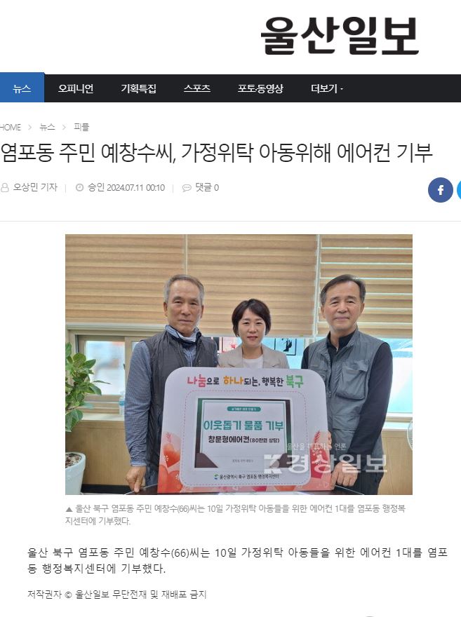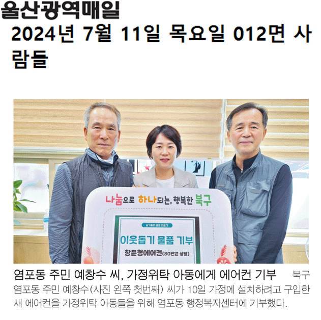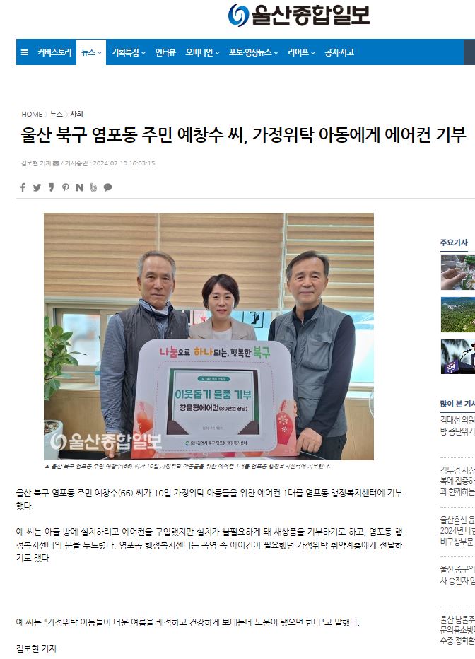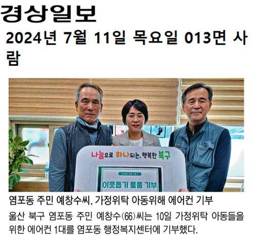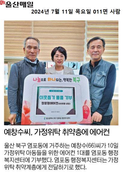 ('24. 7. 10.) 염포동 주민 예창수씨, 가정위탁 아동위해 에어컨 기부