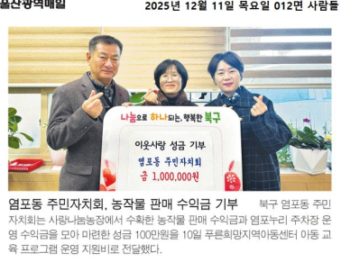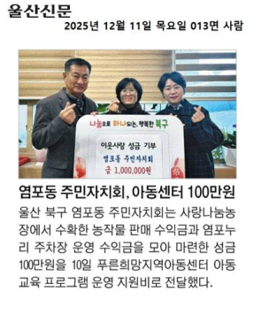 ('25. 12. 10.) 염포동 주민자치회, 100만원 성금 기부로 지역아동센터 아동 교육 지원